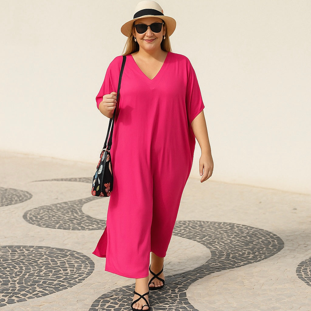 The deep v-neckline and roomy sleeves add to its allure, perfect for lounging poolside. Crafted from a soft and breathable rayon, it is gentle on the skin and adds a touch of sophistication to any summer day.