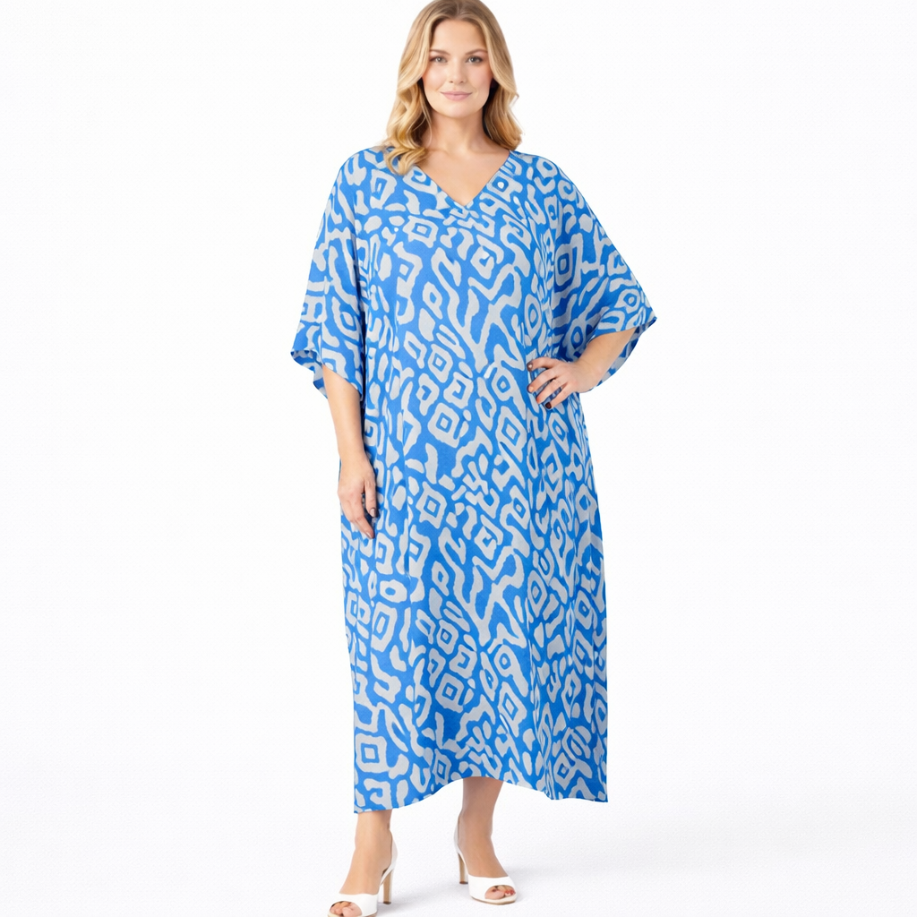 Lovely colours and print on this kaftan top, I am skinny and being one size I worried it would be too much fabric but it looks great on, very elegant and super cool on a hot summer day. First time purchase and I will definitely shop with MK Lane again.