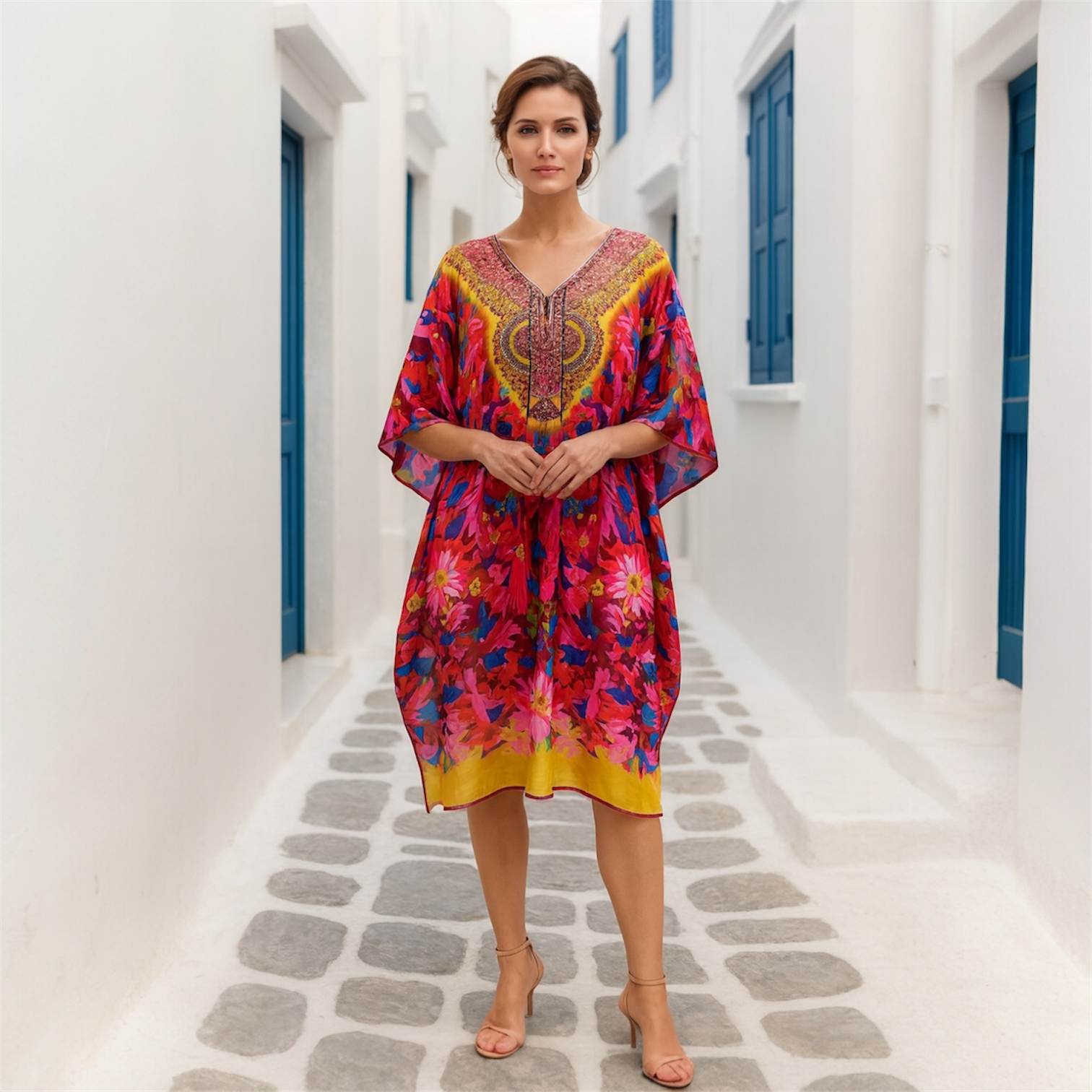 Crafted in India from high-quality, lightweight this kaftan feels beautifully soft against the skin while keeping you cool and comfortable in warmer weather.