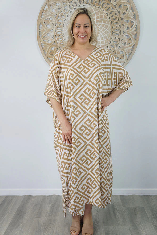 Lovely colours and print on this kaftan top, I am skinny and being one size I worried it would be too much fabric but it looks great on, very elegant and super cool on a hot summer day. First time purchase and I will definitely shop with MK Lane again.