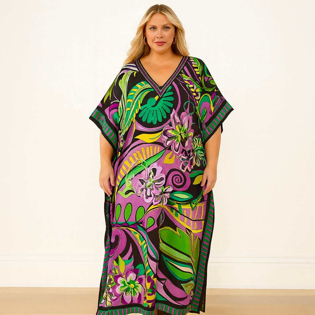 The deep v-neckline and roomy sleeves add to its allure, perfect for lounging poolside. Crafted from a soft and breathable blend of cotton and rayon, it is gentle on the skin and adds a touch of sophistication to any summer day.