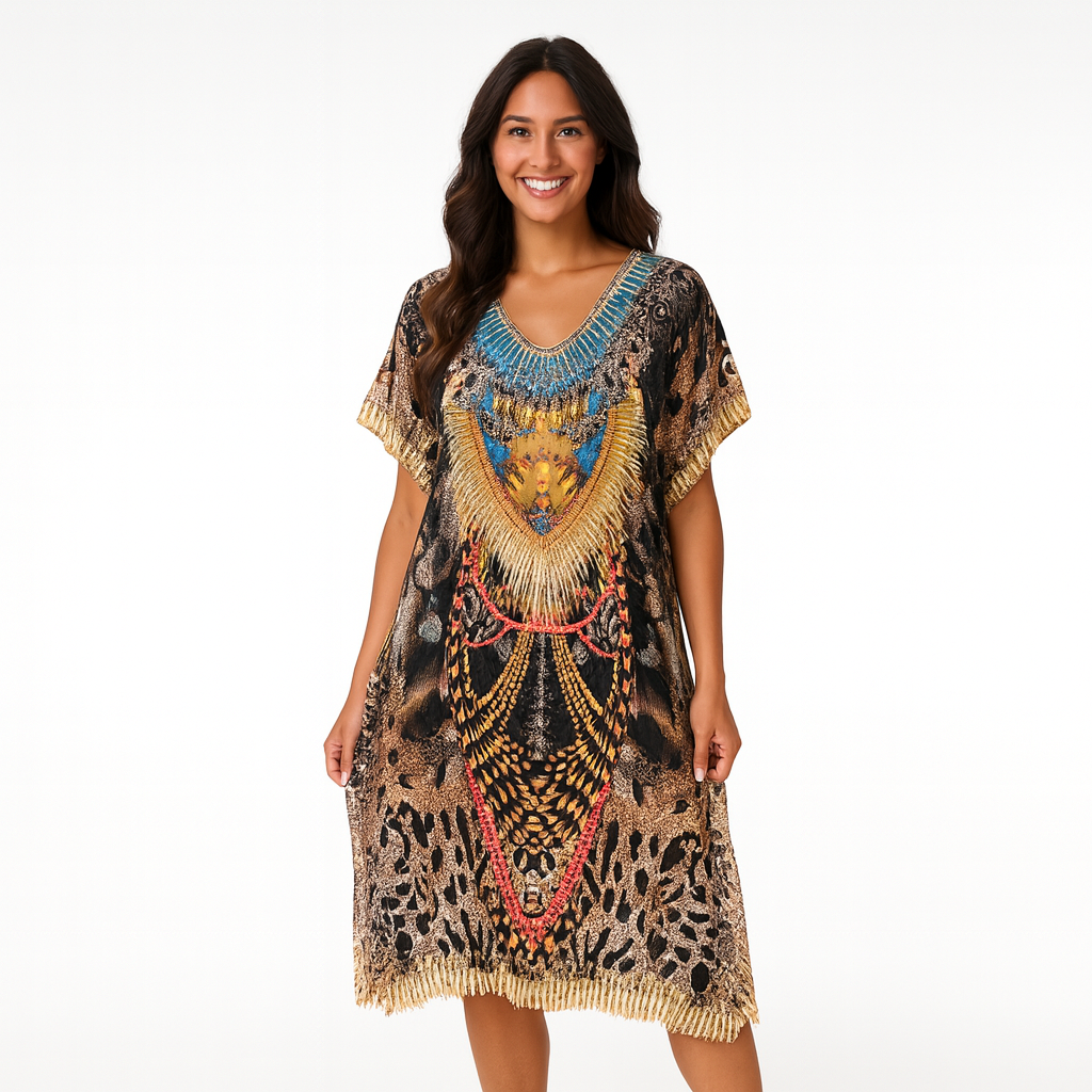 The poncho style Kyra tunic stands out with it's beautifully colourful Prints.